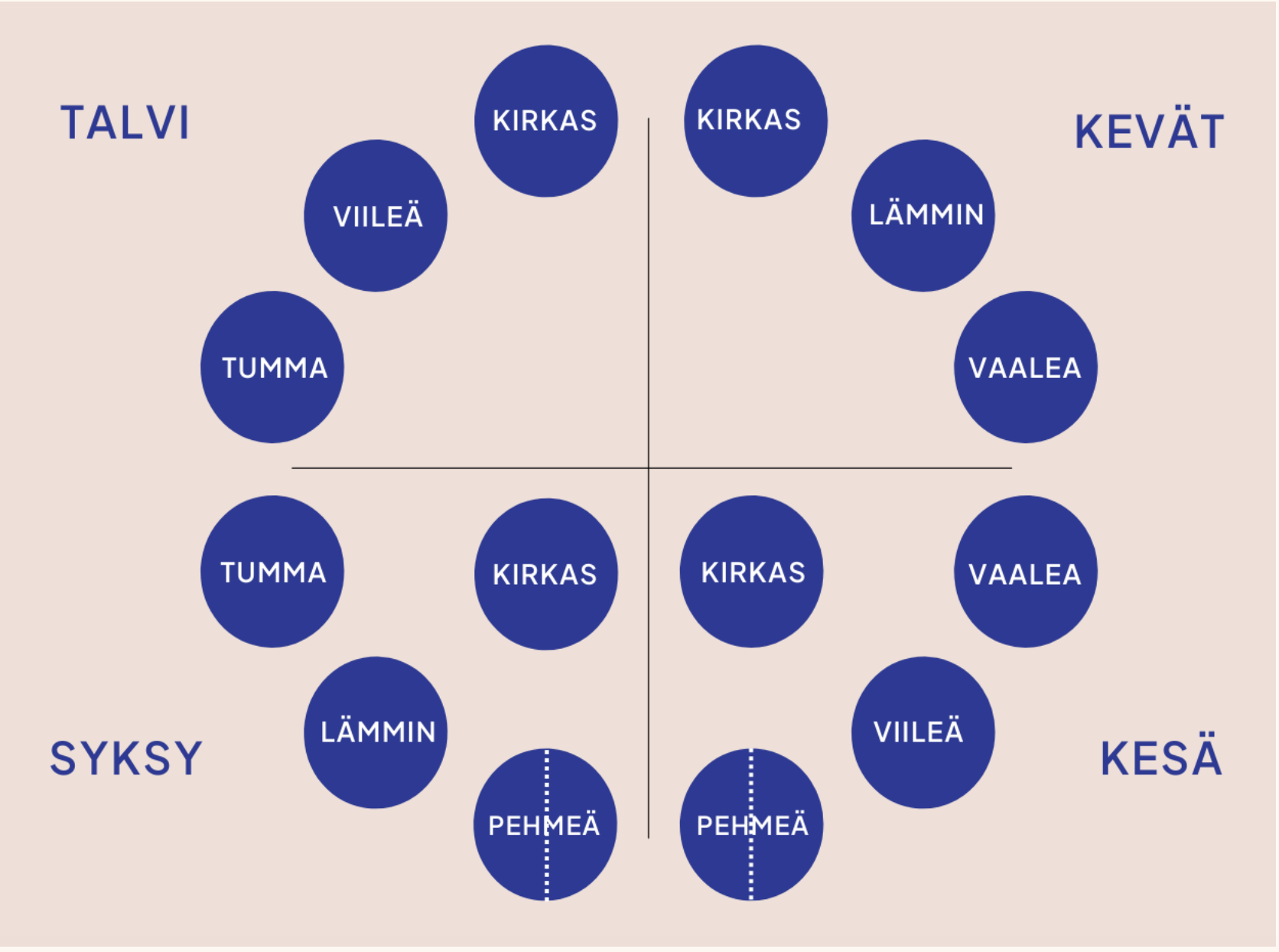 Tulokset: Saat selville oman vuodenaikasi sekä sinulle sopivimmat värit. Katsomme värianalyysissä myös alakategorioita eli menemme syvemmälle eri vuodenaikojen väreihin.